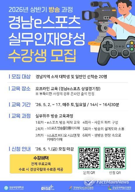 팩트메인뉴스 이훈 기자 | 경상국립대학교 라이즈(RISE) 사업단은 지역 내 e스포츠 산업 전문가를 육성하기 위해 경남e스포츠협회 및 경남문화예술진흥원과 협력하여 ‘2026년 상반기 경남 e스포츠 실무인재 양성 과정’ 수강생을 모집한다.
