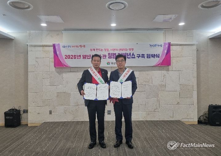 팩트메인뉴스 이훈 기자 | 양산시 시민통합위원회(위원장 박원현)와 양산시 소통담당관은 2026년 4월 16일, 양산시립박물관에서 민‧관 청렴거버넌스 공동 협약식을 체결했다. 이번 협약은 청렴한 행정문화 정착과 시민과의 신뢰 구축을 목표로 마련됐다.