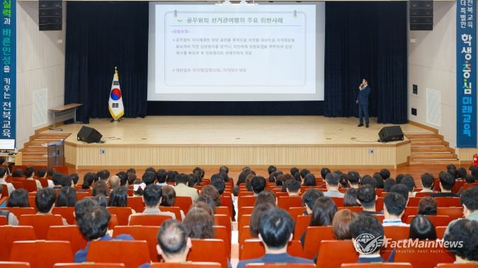 팩트메인뉴스 이훈 기자 | 전북특별자치도교육청은 6월 3일 치러지는 전국동시지방선거를 앞두고 공무원의 정치적 중립 의무에 대한 이해를 높이고 선거 관련 위법행위를 사전에 예방하기 위해 17일 창조나래 시청각실에서 전 직원 대상 직장교육을 실시했다.