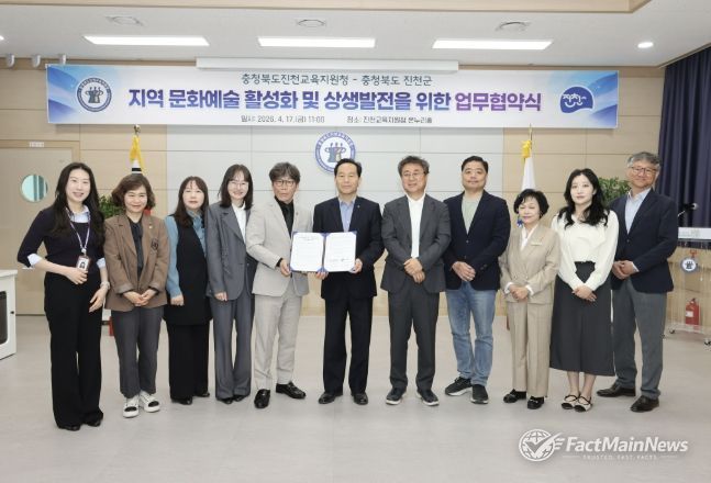팩트메인뉴스 이훈 기자 | 충북 진천군과 진천교육지원청은 17일 진천교육지원청 온누리홀에서 ‘지역 문화예술 활성화와 상생발전’을 위한 업무협약을 체결했다고 밝혔다.
