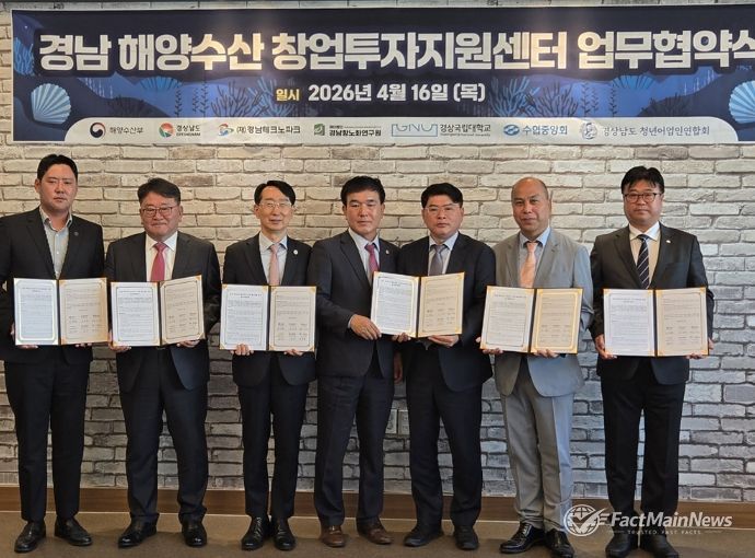 팩트메인뉴스 이훈 기자 | 경상국립대학교 해양과학대학은 경상남도 해양수산 창업투자 활성화를 위해 4월 16일 경남테크노파그에서 경상남도, 경남테크노파크, 경남항노화연구원, 수협중앙회 경남본부, 경상남도 청년어업인연합회 등과 업무협약(MOU)을 체결했다.