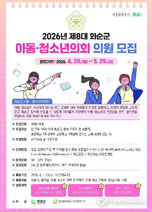 팩트메인뉴스 이훈 기자 | 화순군은 ‘2026년 제8대 화순군 아동·청소년의회’ 의원 30명을 오는 4월 20일부터 5월 29일까지 공개 모집한다고 밝혔다.