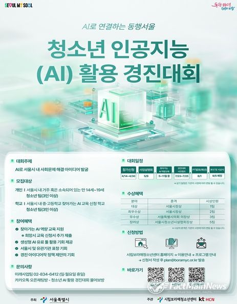 팩트메인뉴스 이훈 기자 | 서울시는 청소년이 인공지능(AI)을 활용해 지역사회 문제해결 아이디어를 제안하고 이를 공공정책으로 연결하는 '2026 청소년 인공지능(AI) 활용 경진대회'를 개최하고 4월 30일까지 참가자를 모집한다.