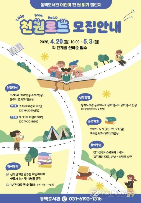 팩트메인뉴스 이훈 기자 | 용인특례시 동백도서관은 어린이 천 권 읽기 챌린지 ‘천권로드(ROAD)’ 참여자를 모집한다고 20일 밝혔다.