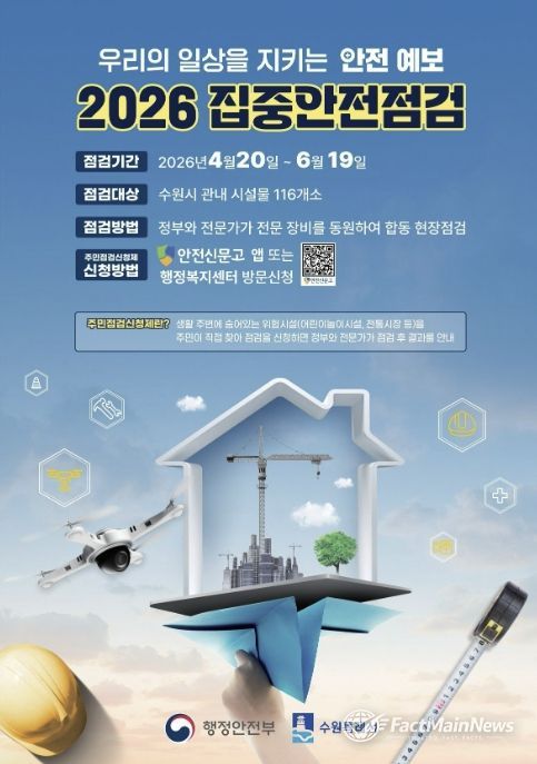 팩트메인뉴스 이훈 기자 | 수원특례시가 안전사고를 예방하고, 시민의 안전 의식을 고취하기 위해 20일부터 6월 19일까지 ‘2026년 집중안전점검’을 한다.