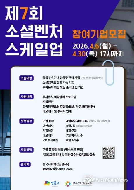 팩트메인뉴스 이훈 기자 | 서울 성동구는 관내 소셜벤처기업을 대상으로 투자 유치 역량 강화를 위해 2026년 제7회 소셜벤처 스케일업 프로그램 참여기업을 모집한다고 밝혔다.