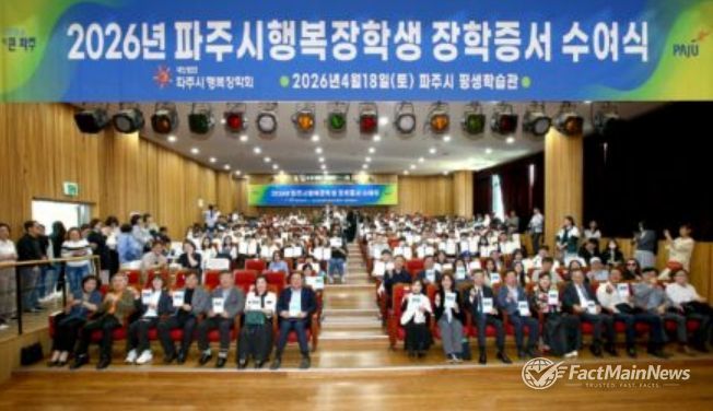 팩트메인뉴스 이훈 기자 | 파주시는 (재)파주시행복장학회가 지난 18일 파주시 평생학습관 대공연장에서 학부모와 장학생 등 200여 명이 참석한 가운데 2026년 장학증서 수여식을 개최했다고 밝혔다.