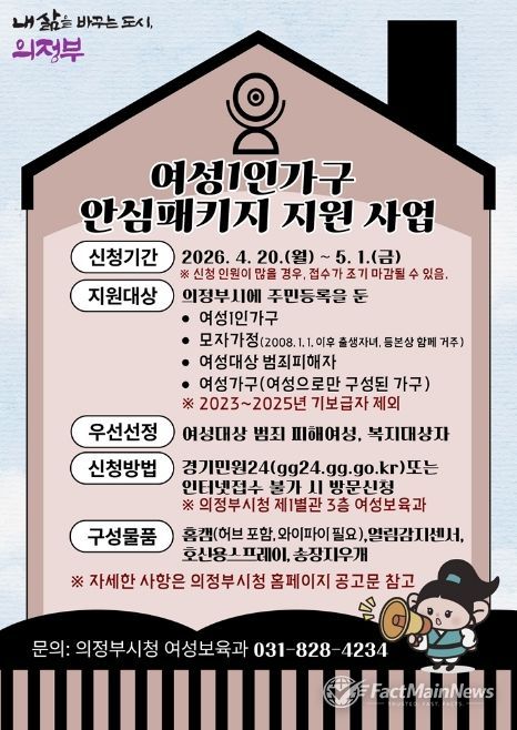 팩트메인뉴스 이훈 기자 | 의정부시는 4월 20일부터 5월 1일까지 12일간 온․오프라인을 통해 여성 1인 가구 안심패키지 지원사업의 신청을 접수한다.