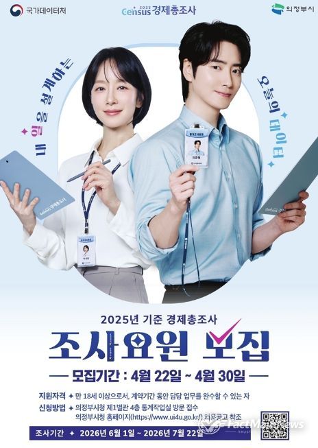 팩트메인뉴스 이훈 기자 | 의정부시는 6월 1일부터 실시되는 ‘2025년 기준 경제총조사’의 원활한 추진을 위해 조사요원 77명을 모집한다.
