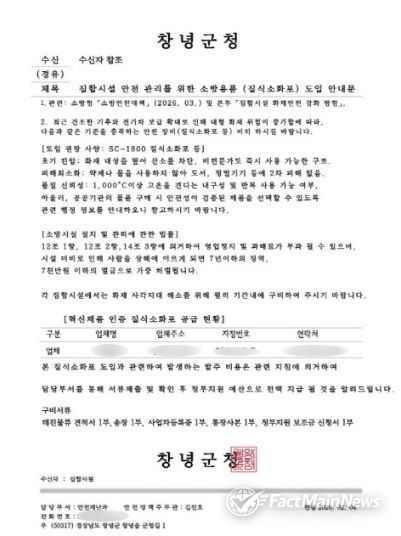 팩트메인뉴스 이훈 기자 | 창녕군은 공무원을 사칭해 관내 장례식장에 소방용품(질식소화포) 구매를 요구하는 보이스피싱 사례가 발생했다고 밝혔다.