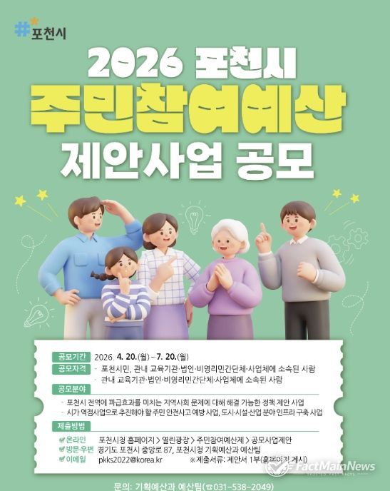 팩트메인뉴스 이훈 기자 | 포천시가 4월 20일부터 오는 7월 20일까지 2027년도 예산편성을 위한 주민참여예산 공모제안사업을 접수하고 있다.