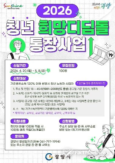 팩트메인뉴스 이훈 기자 | 광양시는 전라남도와 함께 청년의 자산 형성과 미래 준비를 지원하기 위해 ‘2026년 청년 희망디딤돌 통장사업’ 참여자를 모집한다고 밝혔다.