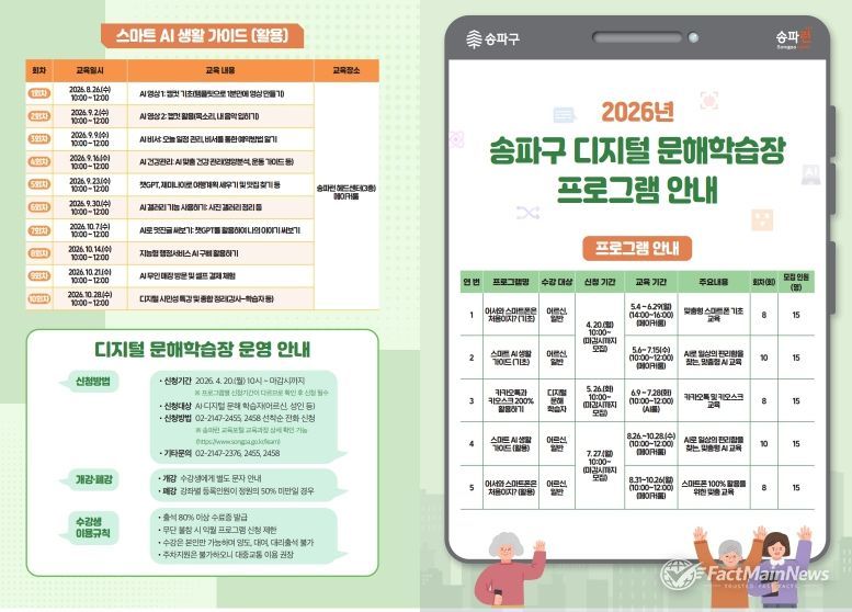 팩트메인뉴스 이훈 기자 | 서울 송파구는 스마트폰과 AI 사용이 익숙하지 않은 주민을 위해 5월부터 ‘디지털 문해학습장’ 교육을 운영한다.