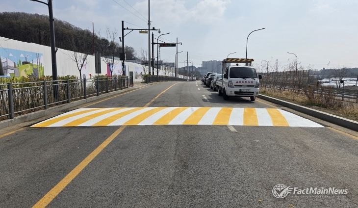 팩트메인뉴스 이훈 기자 | 오산시는 가수초등학교 통학로 안전 확보를 위해 인근 우미린 레이크시티 아파트 공사장 진출입로 주변에 과속방지턱 4개소를 신설했다고 밝혔다.