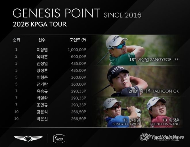 권성열(40)과 왕정훈(31.DAEJIN)이 485포인트로 제네시스 포인트 3위, 이형준(34.웰컴저축은행), 전가람(31.LS)이 360포인트로 제네시스 포인트 5위에 이름을 올렸다.
