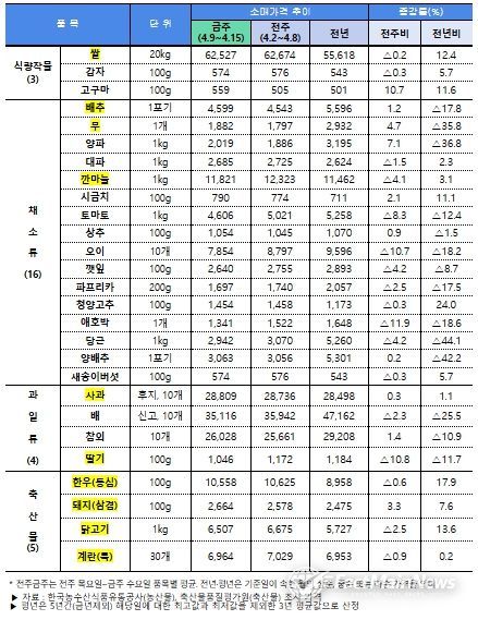 점검 결과, 농산물은 대다수 품목이 전년 대비 낮은 수준이다. 특히, 양파, 양배추, 당근 등 노지채소류는 가격이 큰 폭으로 하락함에 따라 시장격리, 정부 비축물량 출하정지와 함께 소비촉진을 추진하고 있다.