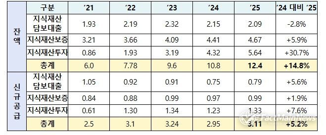 지식재산 금융 잔액은 ’24년 말 10.8조원에서 ’25년 말 12.4조원으로 증가하여 전년대비 14.8% 성장했다. 2025년 지식재산 금융 신규공급은 총 3.1조원으로, 2024년 2.95조원 대비 5.2% 증가했다.