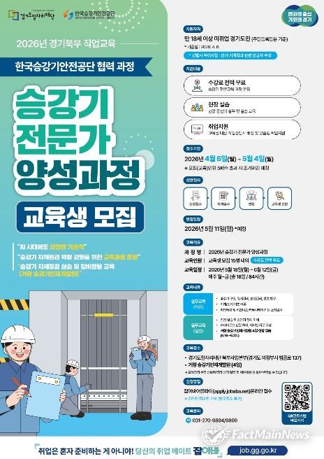 팩트메인뉴스 이훈 기자 | 경기도일자리재단은 승강기 전문 인력 양성을 통해 일자리 문제 해결과 지역경제 활성화를 추진하고자 ‘2026년 승강기 전문가 양성 과정’ 교육생을 모집한다고 21일 밝혔다.