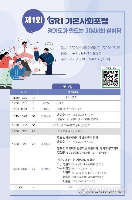 팩트메인뉴스 이훈 기자 | 경기연구원은 오는 23일 오후 3시 수원컨벤션센터 403호에서 ‘경기도가 만드는 기본사회 실험장’을 주제로 ‘제1회 GRI 기본사회포럼’을 개최한다.