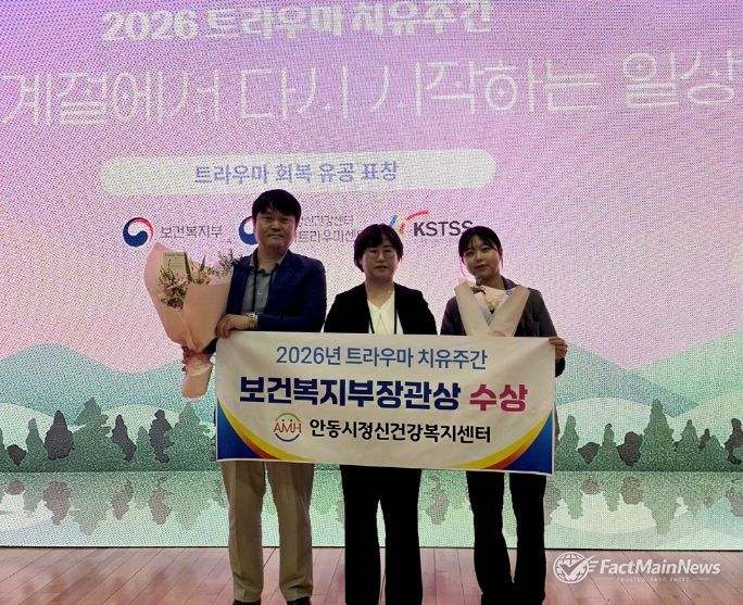 팩트메인뉴스 이훈 기자 | 안동시정신건강복지센터는 20일 국립정신건강센터에서 열린 보건복지부 주최 ‘2026년 트라우마 치유주간’ 시상식에서, 산불 재난 경험자의 심리 회복을 위해 헌신한 공로를 인정받아 보건복지부 장관 표창을 수상했다고 밝혔다.