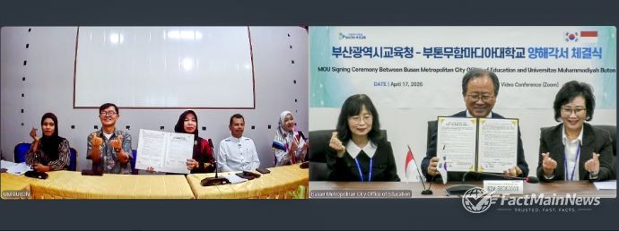팩트메인뉴스 이훈 기자 | 부산광역시교육청은 지난 17일 인도네시아 부톤무함마디아대학교(총장 와 오데 알 자릴리아니, Wa Ode Al Zarliani)와 ‘한국어 교육 활성화 및 문화교류 증진을 위한 양해각서’를 온라인 화상회를 통해 체결했다고 밝혔다.
