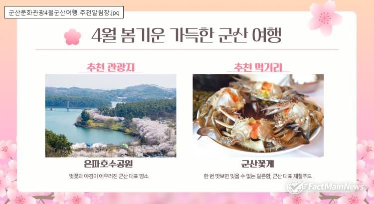 팩트메인뉴스 이훈 기자 | 군산시는 계절과 시기에 맞는 관광 정보를 한눈에 제공하는 ‘월별 추천 콘텐츠 알림창 서비스’를 오는 5월부터 본격 운영한다고 밝혔다.