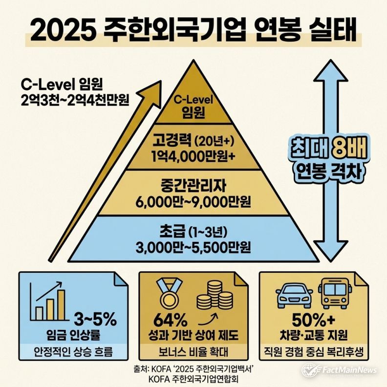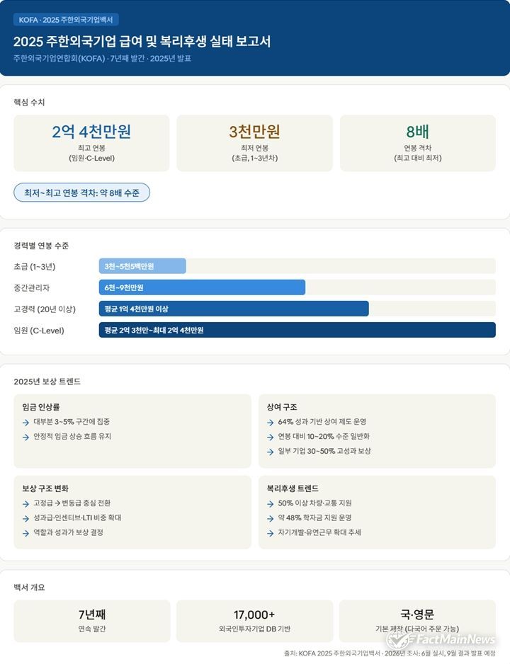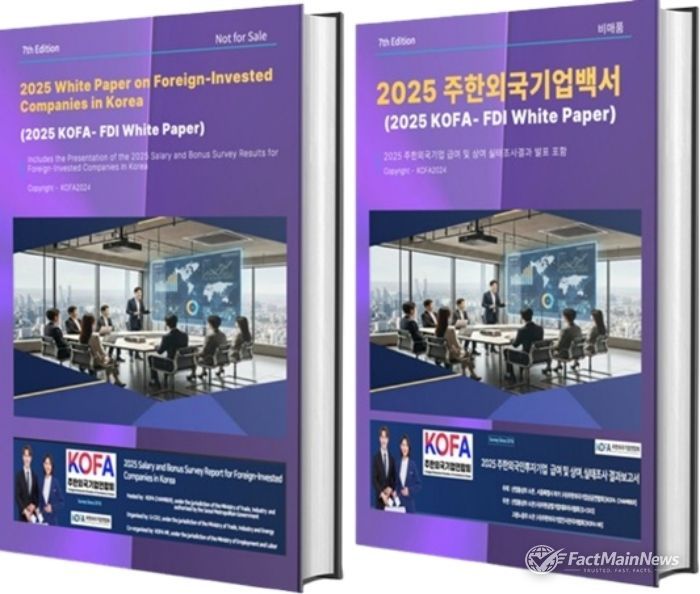 팩트메인뉴스 이훈 기자 | 주한외국기업연합회(상임대표 김종철, KOFA)는 ‘2025 주한외국기업백서’ 혁신판을 발표하고, 작년 6월 실시한 주한외국기업 급여 및 상여금 실태조사와 함께 복리후생 조사 결과를 포함해 공개했다. 이번 백서는 7년째 발간되는 자료로, 기존 조사 대비 한층 고도화된 분석 체계를 적용해 글로벌 전문 조사기관 수준의 HR 리포트로 업그레이드됐다는 평가를 받고 있다.