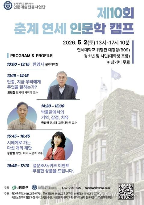 팩트메인뉴스 이훈 기자 | 서대문구가 연세대학교 문과대학과 공동으로 5월 2일 오후 1시부터 5시 10분까지 연세대 위당관 대강당(B09호)에서 ‘제10회 연세 인문학 캠프’를 개최한다.