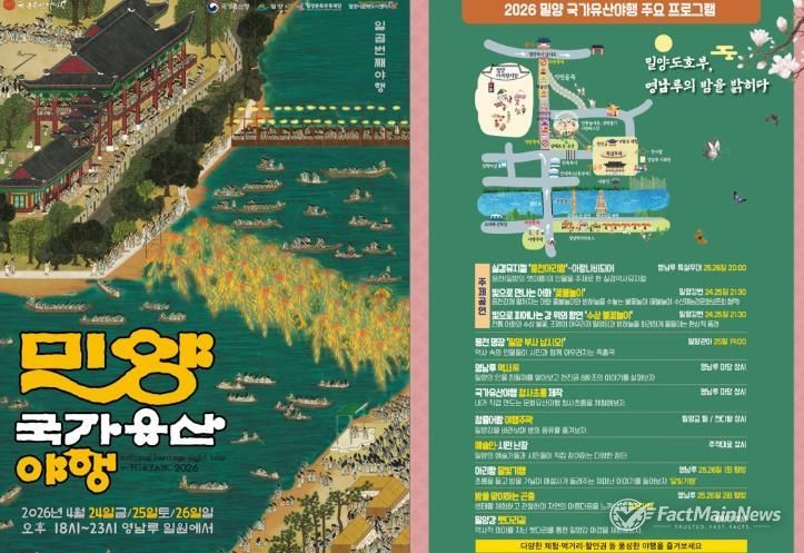 팩트메인뉴스 이훈 기자 | 경남 밀양시가 주최하고 밀양시문화도시센터가 주관하는 ‘2026 밀양 국가유산 야행’이 오는 4월 24일부터 26일까지 3일간 영남루 및 밀양관아, 밀양강 일원에서 펼쳐진다.