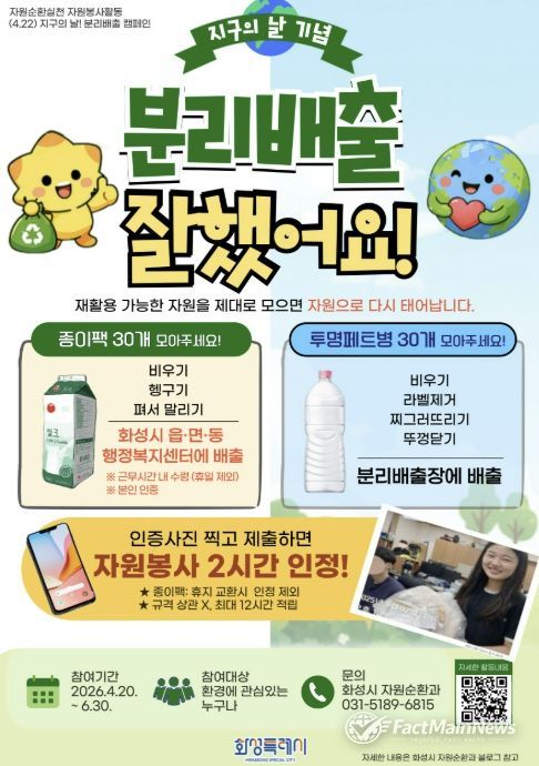 팩트메인뉴스 이훈 기자 | 화성특례시가 2026년 ‘지구의 날(4월 22일)’을 맞아 시민들이 일상 속에서 환경 보호를 실천할 수 있는 자원봉사 활동 '분리배출 잘했어요' 캠페인을 운영한다고 밝혔다.