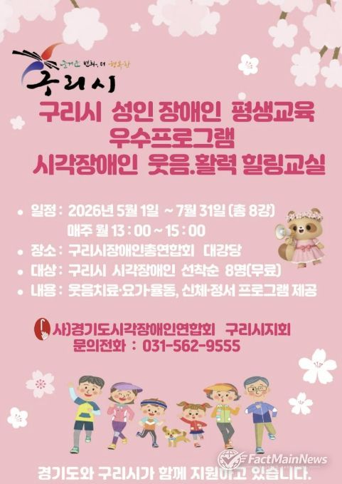 팩트메인뉴스 이훈 기자 | 사단법인 경기도시각장애인연합회 구리시지회는 구리시와 경기도의 지원을 받아 2026년 5월부터 ‘시각장애인 웃음·활력 힐링 교실’을 운영할 예정이라고 밝혔다.