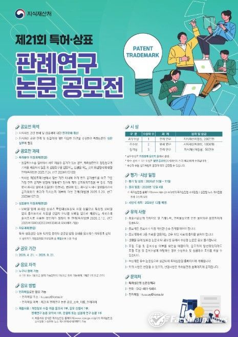 팩트메인뉴스 이훈 기자 | 지식재산처 특허심판원은 지식재산 분야에 대한 연구를 활성화하고 심판제도의 발전 방향을 모색하기 위해 4월 21일~9월 21일까지 '제21회 특허·상표 판례연구논문 공모전'을 개최한다고 밝혔다.