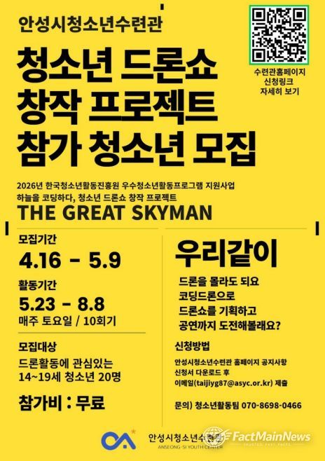 팩트메인뉴스 이훈 기자 | 안성시청소년수련관은 미래 디지털 인재 양성을 위한 청소년 참여형 프로그램 '하늘을 코딩하다, 청소년 드론쇼 창작 프로젝트 ‘THE GREAT SKYMAN’'에 참여할 청소년을 4월 16일 ~ 5월 8일까지 모집한다고 밝혔다.