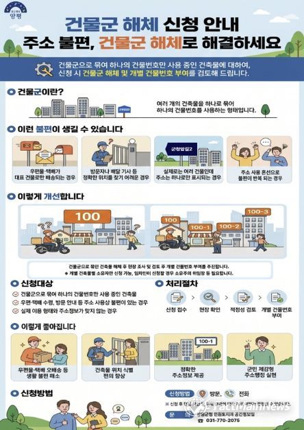 건물군은 여러 개의 건축물을 하나로 묶어 동일한 건물번호를 부여·관리하는 방식이다. 그러나 건물군 내 여러 거주자와 이용자가 있음에도 하나의 건물번호만 사용함에 따라 우편물과 택배, 소포 등이 대표 건물로 집중되는 사례가 발생하고 있다. 이로 인해 등기 반송, 택배 오배송, 방문객 안내 지연 등 생활 속 불편이 지속돼 왔다. 또한 실제로는 서로 다른 건축물임에도 주소상 동일한 건물번호를 사용함으로써 위치 식별이 어렵고, 응급상황이나 안전사고 발생 시 신속한 대응에도 어려움이 있었다.