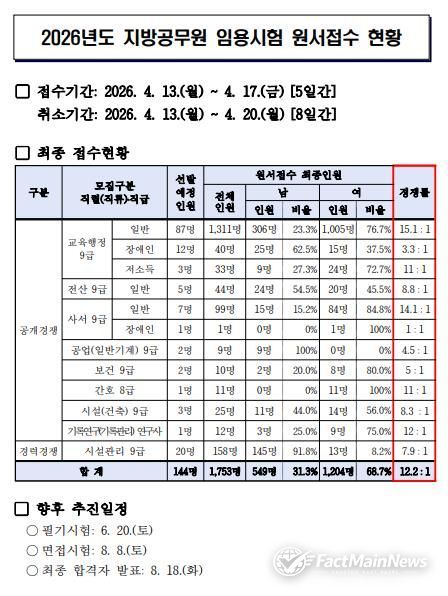 팩트메인뉴스 이훈 기자 | 부산광역시교육청은 지난 13일부터 17일까지 실시한 ‘2026년도 지방공무원 임용시험’ 원서접수 결과 144명 선발에 1,753명이 지원해 평균 12.2대 1의 경쟁률을 보였다고 밝혔다.
