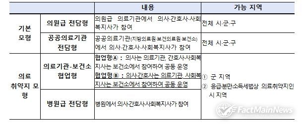 이번 공모에 신설된 모형을 포함한 재택의료센터 참여 모형은 다음 표와 같다.