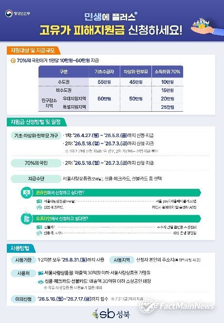 팩트메인뉴스 이훈 기자 | 서울 성북구가 고유가 피해지원금 신청을 오는 4월 27일부터 접수한다.
