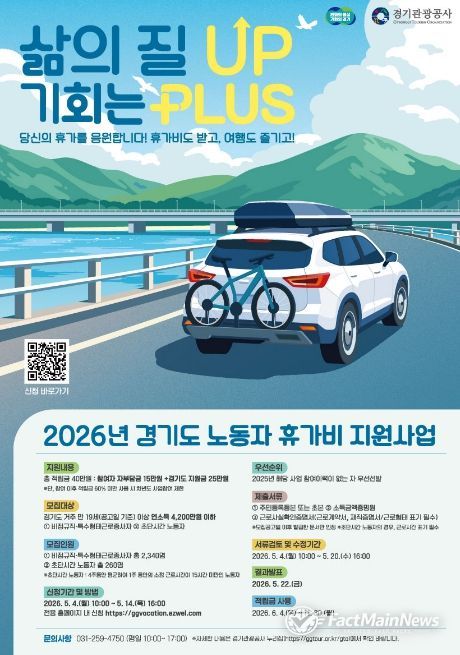 팩트메인뉴스 이훈 기자 | 경기도가 경제적 부담으로 휴식을 포기했던 비정규직과 특수형태근로종사자에게 휴가비를 지원하는 ‘취약노동자 휴가비 지원사업’ 참여자를 5월 4일부터 14일까지 모집한다.