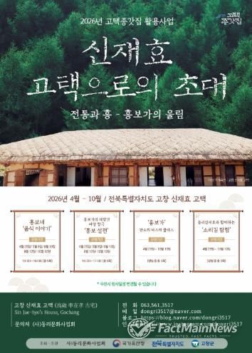팩트메인뉴스 이훈 기자 | 고창군이 (사)동리문화사업회와 국가유산청 고택·종갓집 활용사업으로 ‘신재효 고택으로의 초대’를 고창 신재효 고택과 판소리공원 일대에서 오는 25일부터 10월까지 본격 운영한다고 밝혔다.