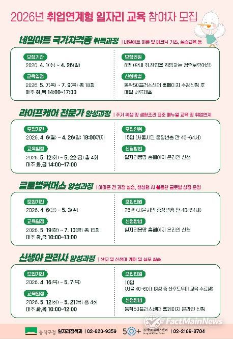 팩트메인뉴스 이훈 기자 | 동작구가 취업을 희망하는 주민의 실무 역량 강화와 현장 진출 지원을 위해 ‘취업연계형 일자리사업’을 확대하고 신규 참여자를 모집한다고 밝혔다.