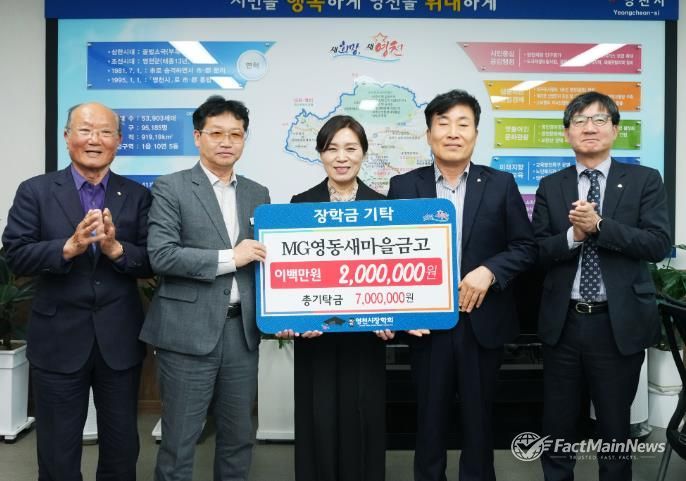 팩트메인뉴스 이훈 기자 | 영천시는 지난 21일 영동새마을금고가 ‘2026년 경북새마을금고 경영평가 연도대상’ 우수상 수상을 기념해, 영천시장학회에 지역인재 육성을 위한 장학금 200만원을 기탁했다고 밝혔다.
