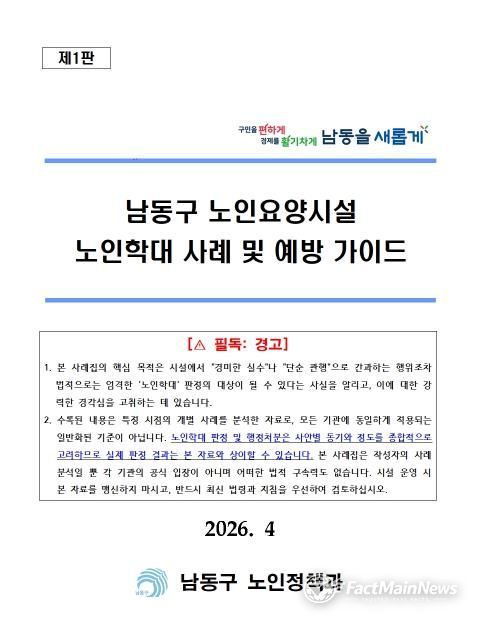 팩트메인뉴스 이훈 기자 | 인천시 남동구가 사후 처분 중심의 행정에서 벗어나 현장의 혼란을 선제적으로 해결하는 적극행정의 일환으로 인천시 최초로 ‘남동구 노인요양시설 노인학대 사례 및 예방가이드’를 발간한다고 22일 밝혔다.