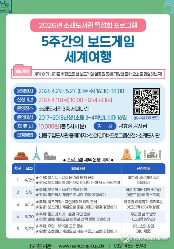 팩트메인뉴스 이훈 기자 | 인천시 남동남동구립도서관은 지역주민들에게 다채로운 독서문화 체험의 장을 제공하기 위해 ‘2026년 특성화 프로그램’을 운영한다고 22일 밝혔다.
