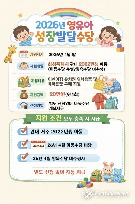 팩트메인뉴스 이훈 기자 | 화성특례시는 어린이집 및 유치원 입학 초기 영유아 가정의 양육 부담을 덜고 아동의 건강한 성장을 지원하기 위해 ‘2026년 영유아 성장발달수당’을 지급한다고 밝혔다.