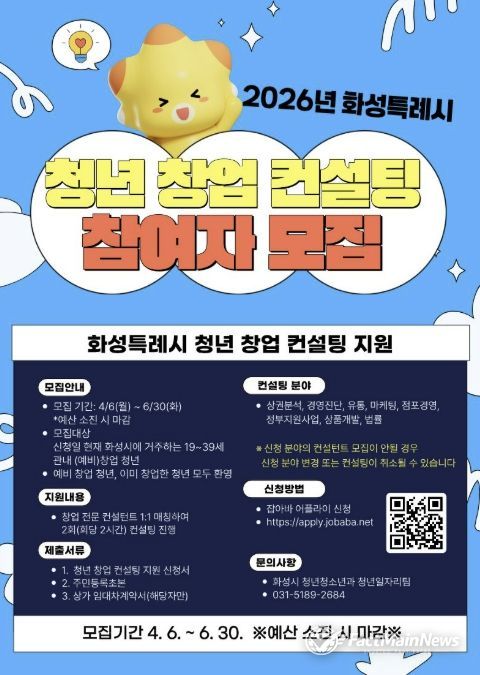 팩트메인뉴스 이훈 기자 | 화성특례시는 오는 6월 30일까지 ‘2026년 청년 창업 컨설팅 지원사업’ 참여자를 모집한다.