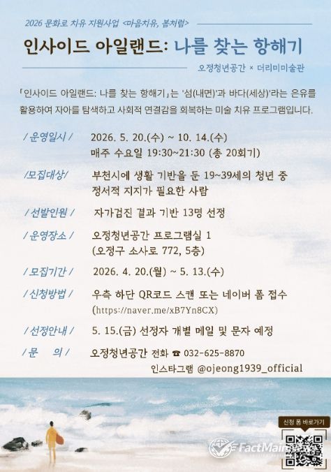 팩트메인뉴스 이훈 기자 | 부천시는 오정청년공간에서 정서적 고립감을 겪는 청년을 위한 미술 치유 프로그램 ‘인사이드 아일랜드: 나를 찾는 항해기’ 참여자를 5월 13일까지 모집한다.