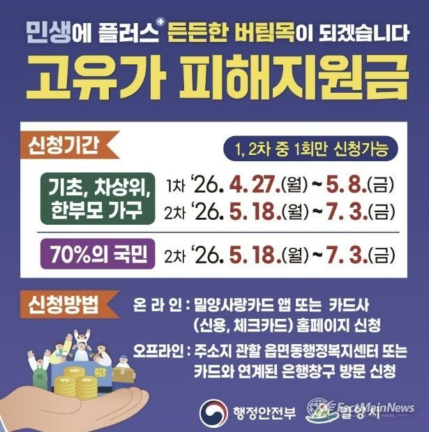 팩트메인뉴스 이훈 기자 | 경남 밀양시는 고유가로 인한 시민 부담 완화를 위해 4월 27일부터 7월 3일까지 ‘고유가 피해지원금’ 신청을 접수한다.