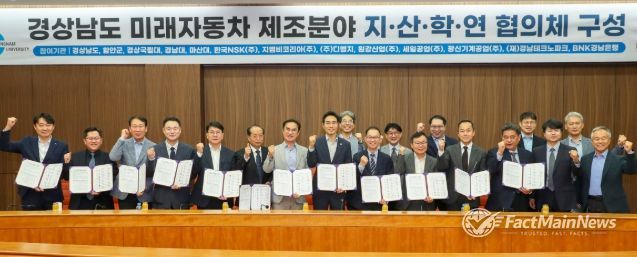팩트메인뉴스 이훈 기자 | 경상국립대학교는 4월 20일 경남대학교 한마미래관에서 경상남도, 함안군, 지역 대학, 자동차 부품기업, 지역혁신기관, 금융기관과 함께 ‘경상남도 미래자동차 제조분야 지·산·학·연 협의체 구축을 위한 업무협약’을 체결하고, 지역 전략산업 육성과 미래차 인재 양성을 위한 협력체계를 본격 가동했다.