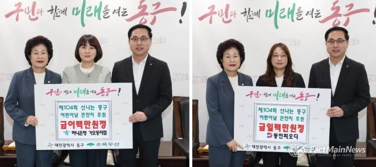 팩트메인뉴스 이훈 기자 | 대전 동구는 22일 구청장 접견실에서 하나은행 가오동지점‧동인피오디와 ‘제104회 신나는 동구 어린이날 큰잔치’를 위한 후원금 기탁식을 개최했다고 밝혔다.