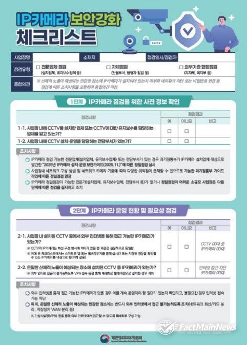 팩트메인뉴스 이훈 기자 | 개인정보보호위원회는 지난해 12월 관계부처 합동으로 발표한 'IP카메라 보안 관리체계 고도화 방안'의 후속 조치로 관계부처, 지자체, 주요 직능단체 등과 함께 ‘IP카메라 보안 강화를 위한 민관협력 캠페인’을 추진한다.